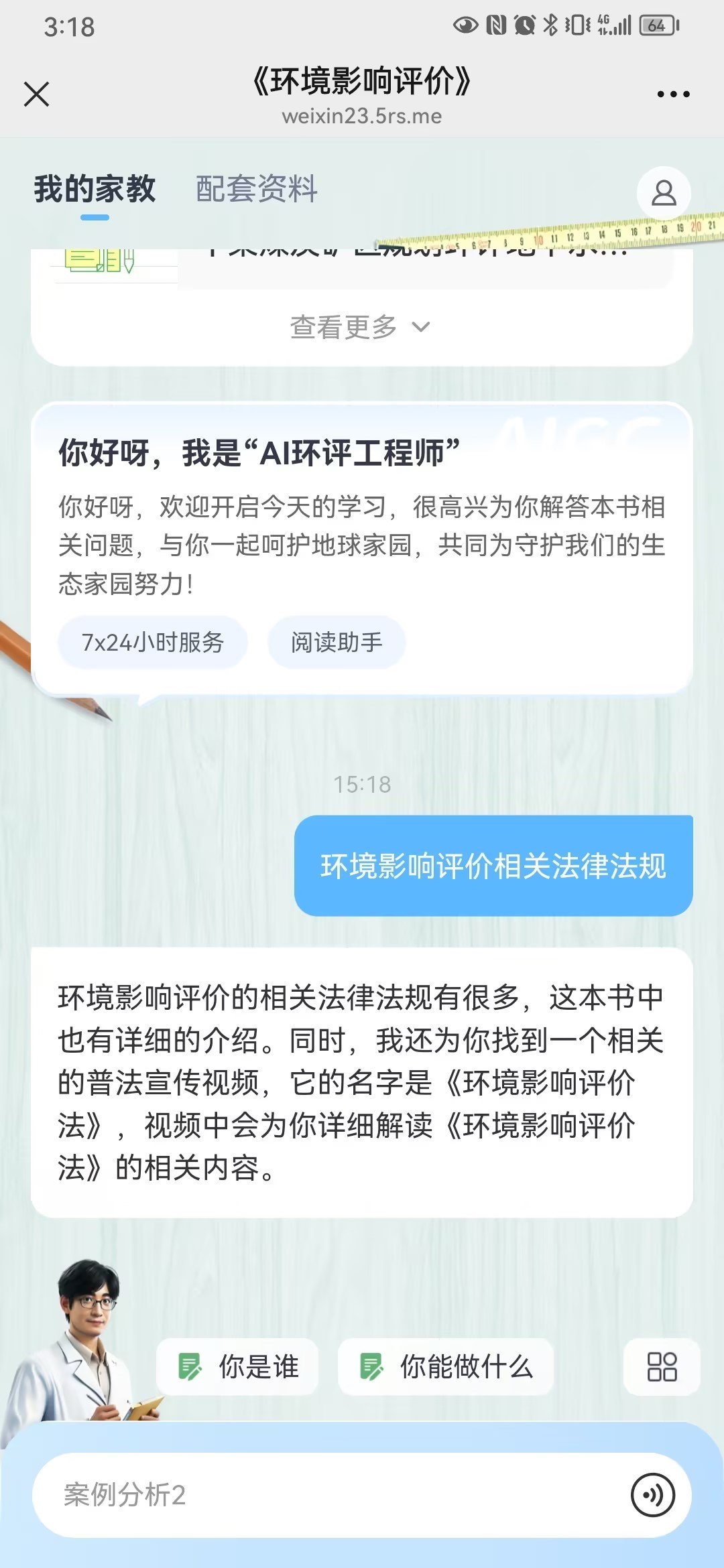 值得一提的是,本書不但附帶教學(xué)課件、各章習(xí)題及答案、在線課題、案例分析、法律法規(guī)等免費(fèi)學(xué)習(xí)資源,還引入了“AI環(huán)評工程師”,可以實(shí)現(xiàn)7*24小時(shí)在線解答本書相關(guān)問題,可以稱為環(huán)境影響評價(jià)版“Deepseek”。