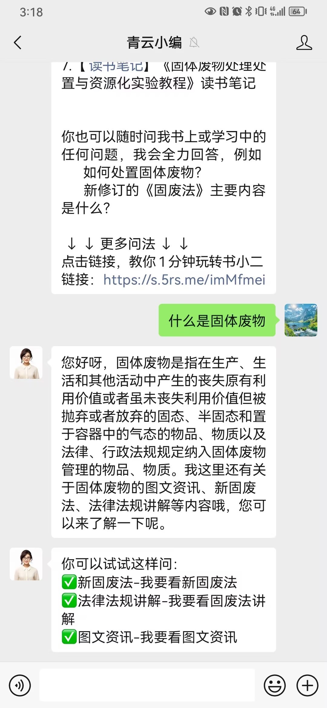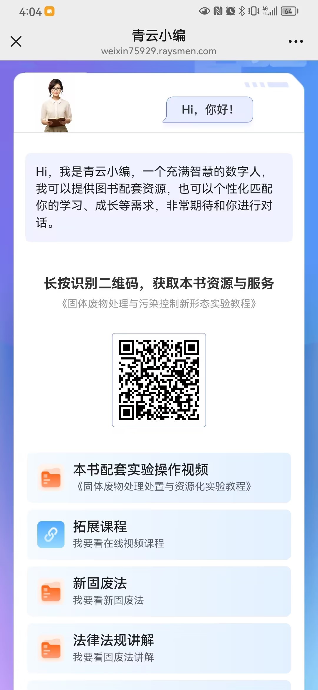 2023年開始,中國環(huán)境出版集團(tuán)開始探索使用“AI數(shù)字人”應(yīng)用。在《固體廢物處理與污染控制新形態(tài)實(shí)驗(yàn)教程》(高校環(huán)境類新形態(tài)系列教材)中,“AI青云小編”便可實(shí)現(xiàn)人機(jī)交互問答,方便讀者獲取教材所配套的操作視頻、在線微課、相關(guān)法律解讀等,滿足個(gè)性化的學(xué)習(xí)、成長需求。