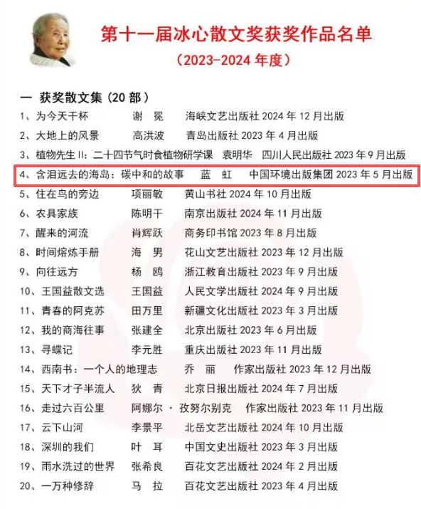 2025年10月30日,第十一屆冰心散文獎(jiǎng)在貴州遵義仁懷市揭曉。我集團(tuán)出版的《含淚遠(yuǎn)去的海島:碳中和的故事》成功入選。
