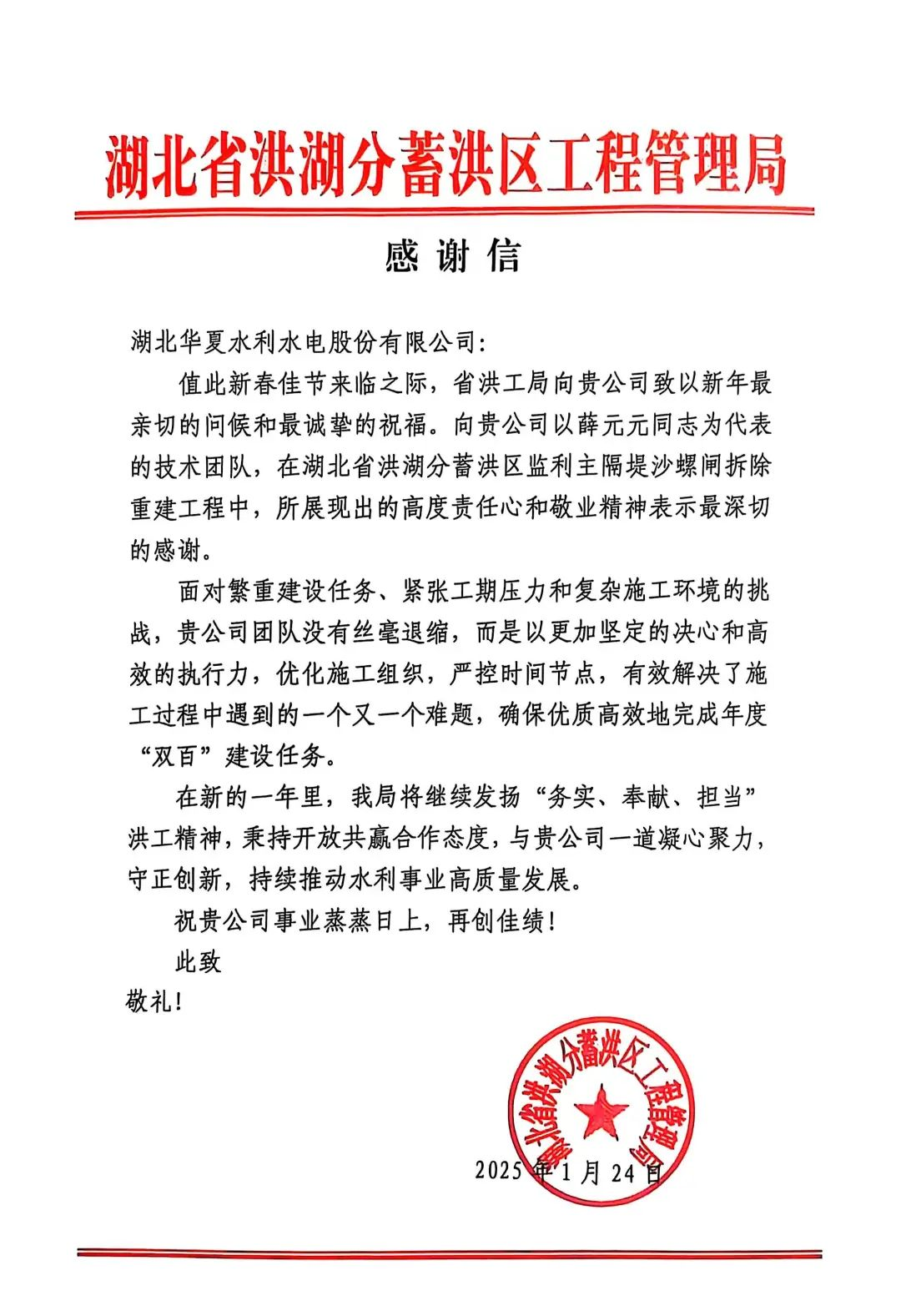 湖北華夏水利建設(shè)的沙螺閘拆除重建工程自開工以來,項目部堅持以強烈的使命感推動工程建設(shè),以高度的責(zé)任心踐行國企擔(dān)當(dāng)。圓滿完成了沙螺閘拆除重建項目年度“雙百”建設(shè)任務(wù),獲湖北省洪湖分蓄洪區(qū)工程管理局感謝信。