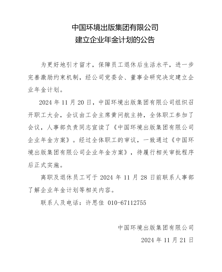 中國(guó)環(huán)境出版集團(tuán)有限公司建立企業(yè)年金計(jì)劃的公告
